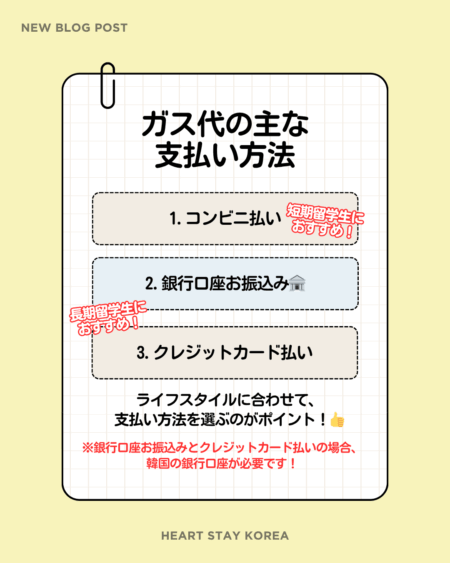 韓国でのガス代の支払い方法を3つ紹介します。